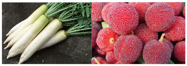杨梅含有丰富的植物色素,若将其与萝卜一起食用,经胃肠道的消化分解,可产生抑制甲状腺功能的物质,诱发甲状腺肿。