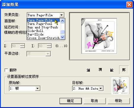在这里面有好多特效可以供我们套用。我现在选择的是可以象书翻页似的特效,它的英文叫:Turn Page-Film