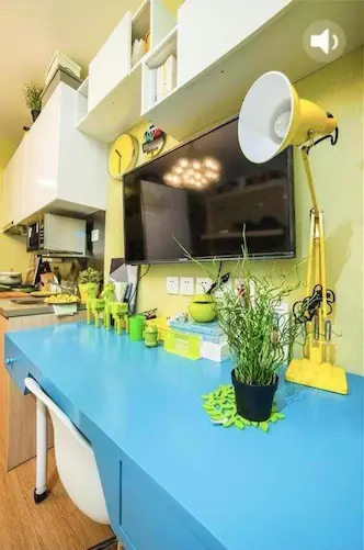 带滑轮可移动的办公桌, 随时可以成为合格的餐桌,茶几也成为魔术空间的道具,它附带的弹出式抽屉,把生活中的琐碎收纳其中。