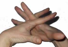 两手虎口相扣式(手心向下,除大拇指外,其余四指伸直,两手虎口处相碰,扣三十六下):