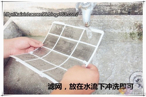 滤网清洗教程: 在取下滤网以后 ,我们可将滤网,放置在流动的水流下,进行冲洗。附着在滤网
