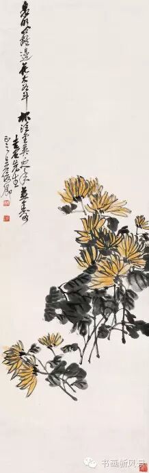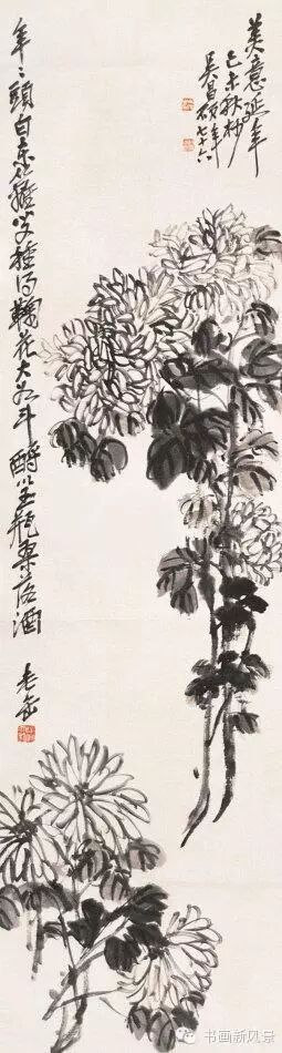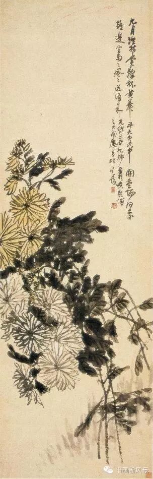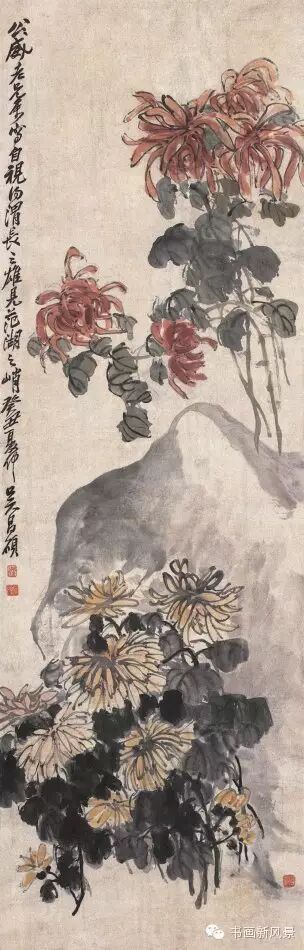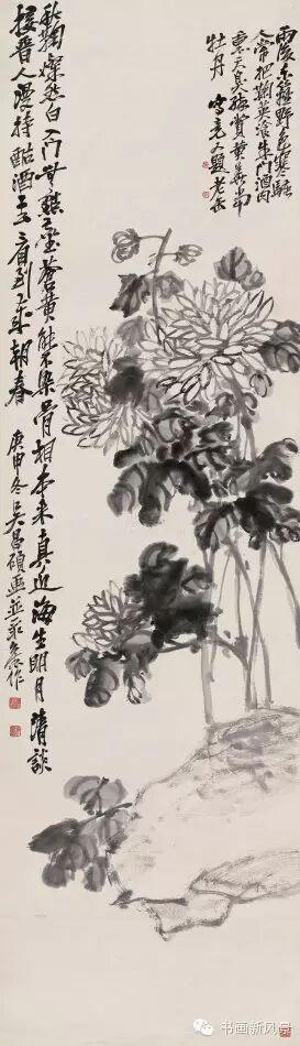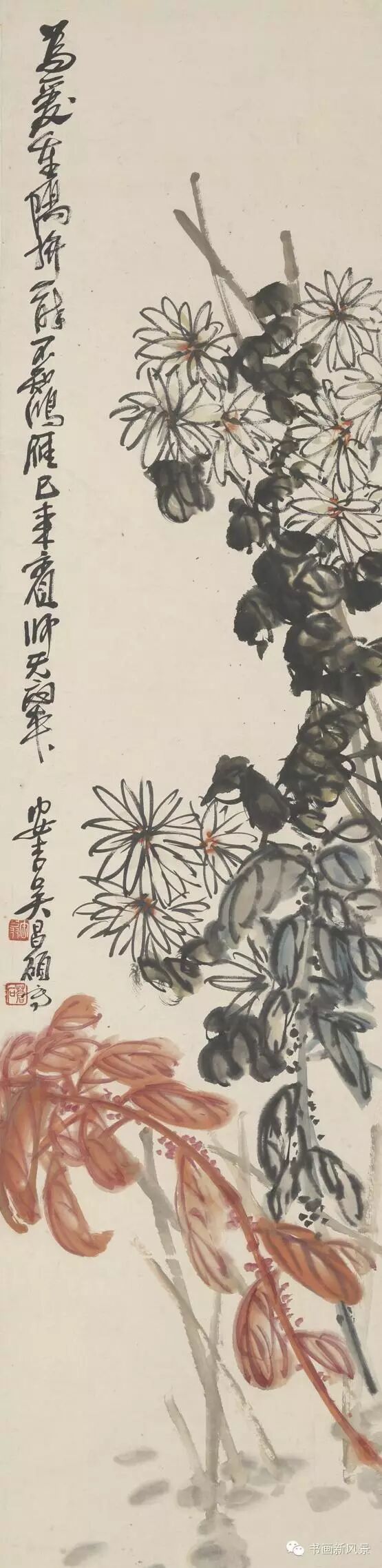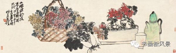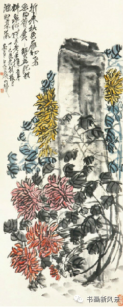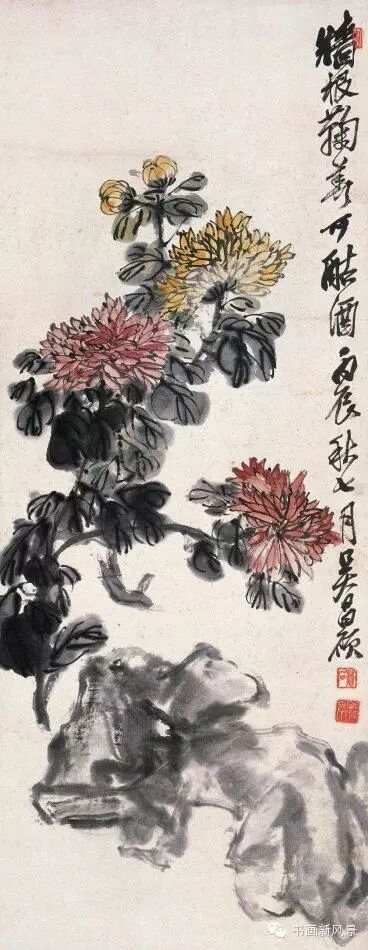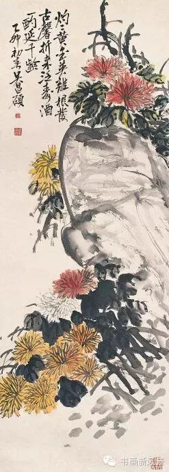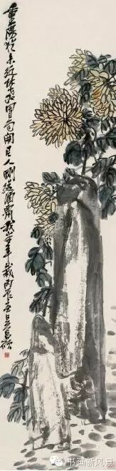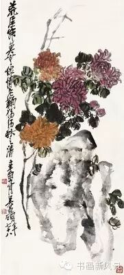 吴昌硕笔下的菊花线条凝练遒劲,刚柔并济;墨色浓淡相间,不落俗格。或伴以山岩、野石、溪水,或插入孤高细瘦的古瓶,皆与秋菊幽独淡雅、冷逸傲世的情态相映成趣,画幅留白处大量的题咏也使咫尺空间洋溢着抒情的人文气息。