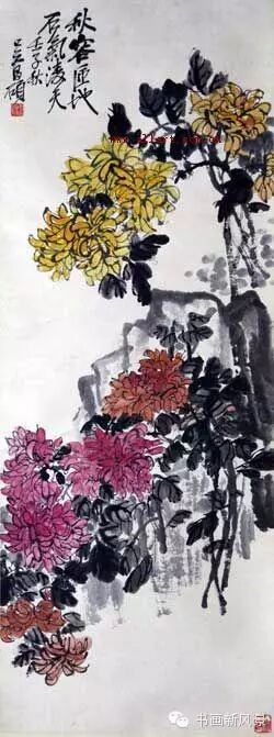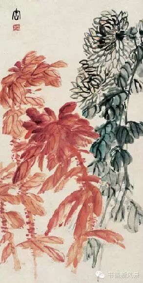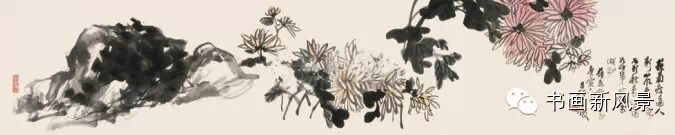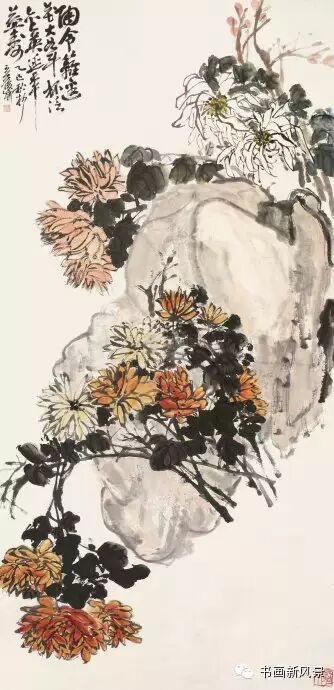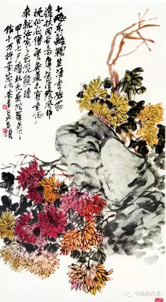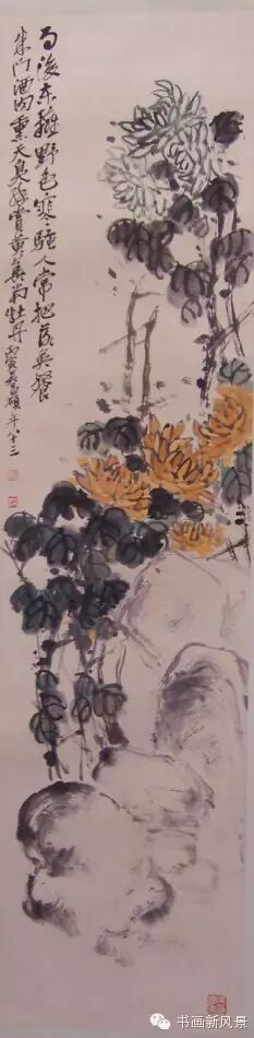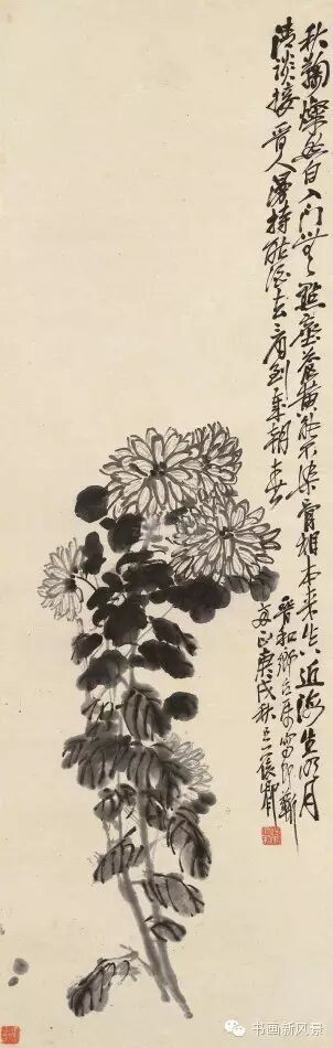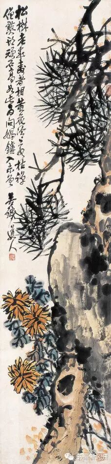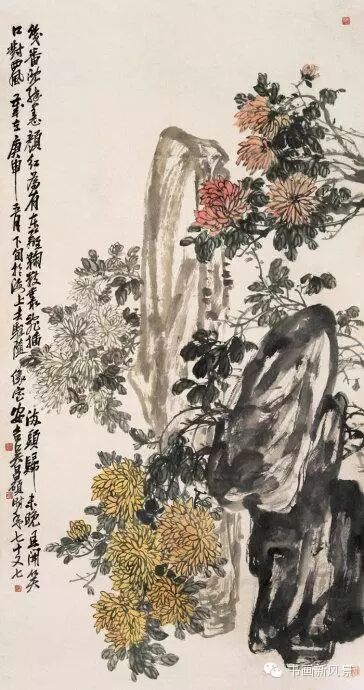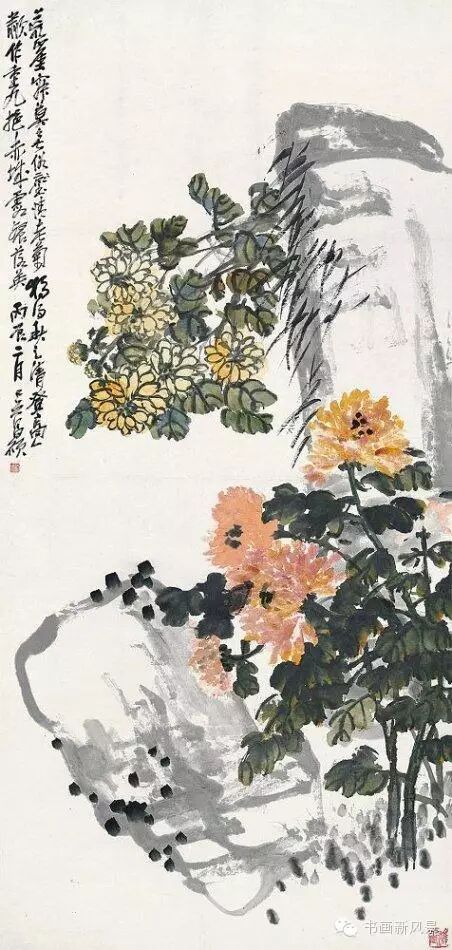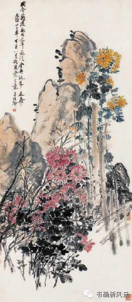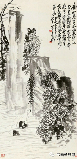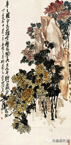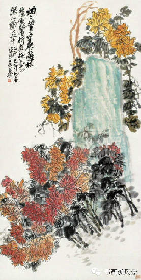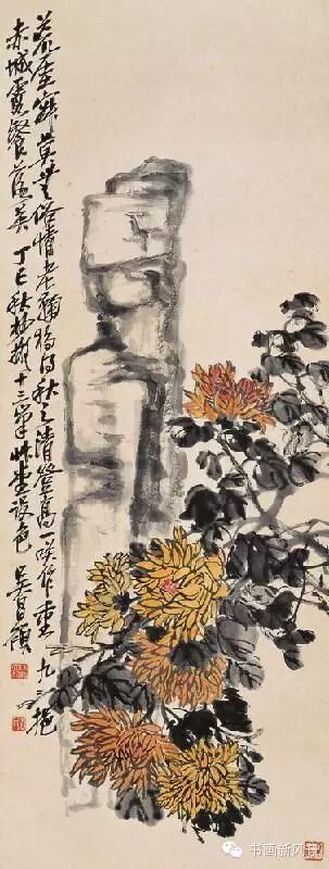 吴昌硕笔下的菊花线条凝练遒劲,刚柔并济;墨色浓淡相间,不落俗格。或伴以山岩、野石、溪水,或插入孤高细瘦的古瓶,皆与秋菊幽独淡雅、冷逸傲世的情态相映成趣,画幅留白处大量的题咏也使咫尺空间洋溢着抒情的人文气息。