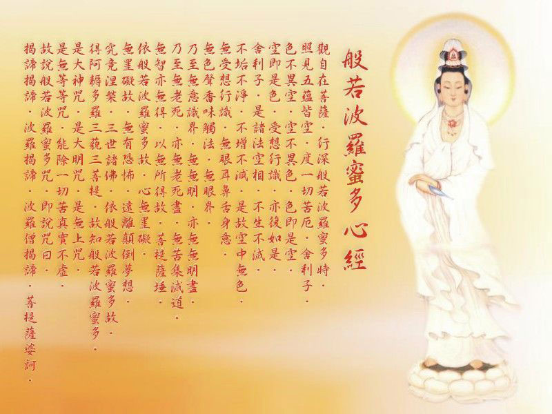 观自在菩萨,行深般若波罗蜜多时,照见五蕴皆空,度一切苦厄。舍利子,色不异空,空不异色,色即是空,空即是色,受想行识,亦复如是。舍利子,是诸法空相,不生不灭,不垢不净,不增不减。是故空中无色,无受想行识,无眼耳鼻舌身意,无色声香味触法,无眼界,乃至无意识界。无无明,亦无无明尽,乃至无老死,亦无老死尽。无苦集灭道,无智亦无得。以无所得故,菩提萨埵,依般若波罗蜜多故,心无挂碍,无挂碍故,无有恐怖,远离颠倒梦想,究竟涅槃。三世诸佛,依般若波罗蜜多故,得阿耨多罗三藐三菩提。故知般若波罗蜜多,是大神咒,是大明咒,是无上咒,是无等等咒,能除一切苦,真实不虚。故说般若波罗蜜多咒,即说咒曰:揭谛揭谛,波罗揭谛,波罗僧揭谛,菩提萨婆诃。