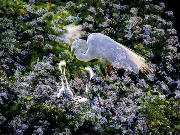 比如,我在拍摄鄱阳湖畔象山林场白鹭喂食的照片时发现,白鹭喂食时,往往是大鸟先在巢边落脚,然后将头向上升起反哺食物,这时巢里的小白鹭一个个争先恐后地将头向上伸。这时我会将构图定格在喂食的活动区域,当动作发生时尽可能地释放快门。