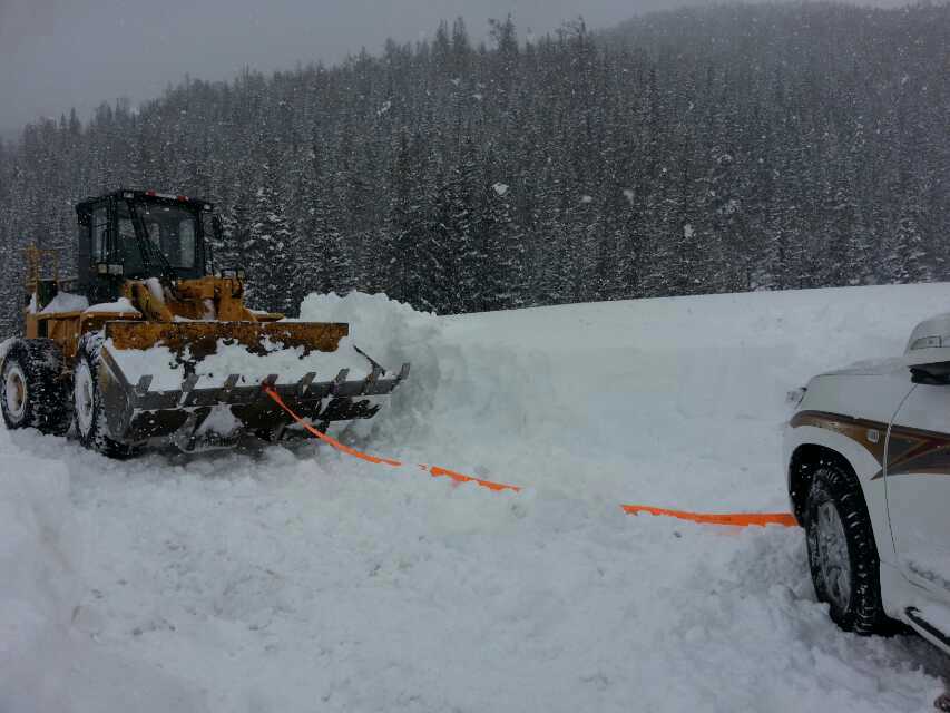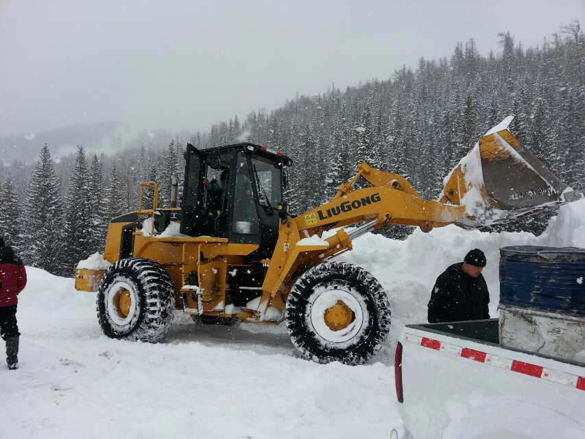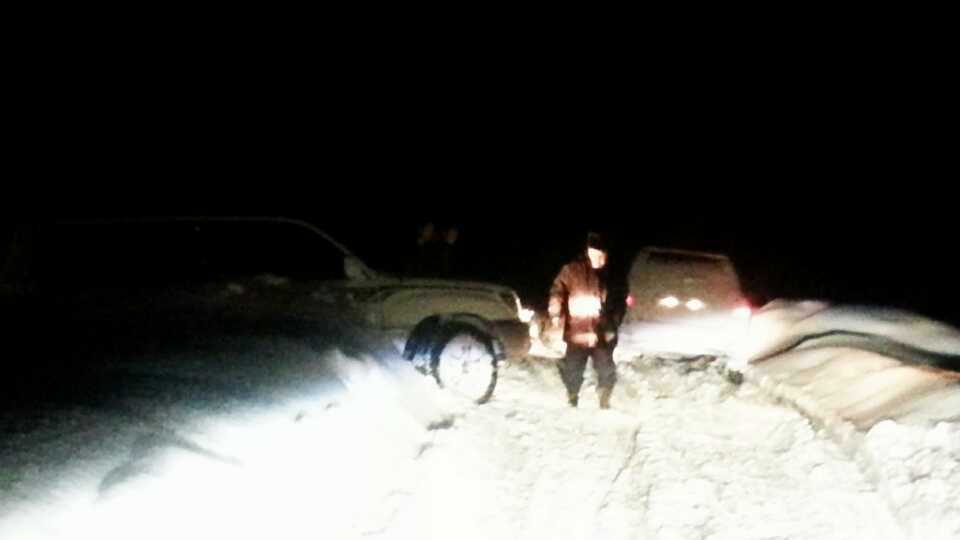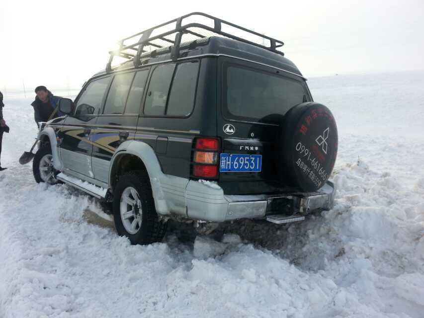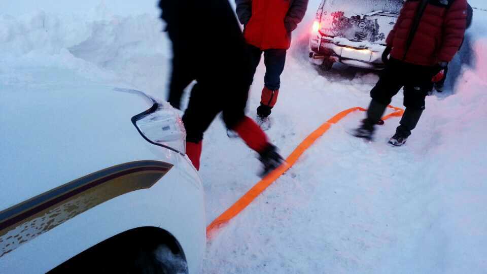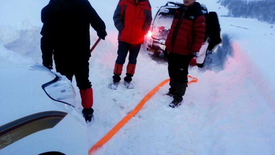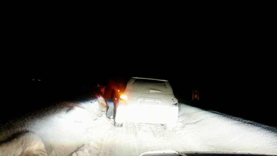 说:布尔津至冲乎儿途中,部分路段积雪,有车滑入路基雪中,准备救援~