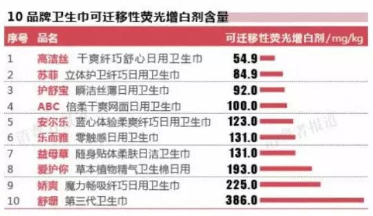 《消费者报道》曝光乐而雅、护舒宝、苏菲、娇爽、ABC、益母草、安尔乐、高洁丝、舒珊和爱护你这十大品牌卫生巾产品,均检出可迁移性荧光增白剂,含量从54.9 mg/kg-386 mg/kg不等。其中,自我宣传中承诺“绝无荧光剂的”台湾舒珊卫生巾荧光剂含量最高,是含量最低的高洁丝的7倍。所检测出的卫生巾品牌几乎涉及杭州超市所出售卫生巾的所有主流品牌。