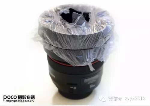 2、在保鲜袋中间撕个口子,不能大于遮光罩