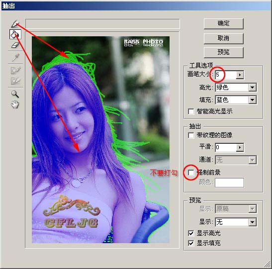 全色抠取图片,不要在强制前景处打勾,用高光器工具沿边缘描绿色,笔触要适当,小一点会更精确,一般在5左右,用填充工具把中间填充蓝色。见图13、 14、效果见图15。