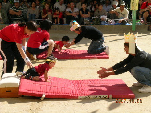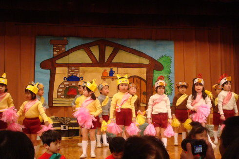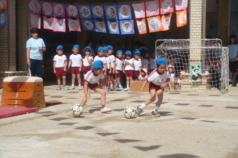 日本幼儿园到了年中组,开始上每周一次的jumping课,相当于中国的体育和形体课;到了年长组,就有了足球大会,孩子们成天不是练习打鼓,就是练习足球,而且不停有幼儿园之间的比赛,女孩子的身上青一块、紫一块的,但是体力和勇气都练出来了。