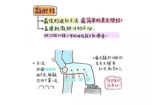 因此建议你每天用力敲打胆经,左右各200下,提高胆汁分泌速度,让头发健康、黑亮。另外,敲胆经还能帮助大腿排出堆积在外侧的脂肪,让你放心穿短裙!