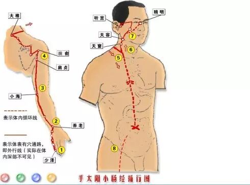 小肠经由眼角内侧半寸处的晴明穴开始,经由脸颊、脖子,贯穿手臂,止于小拇指指尖。小肠的功能是消化和吸收,如果它的功能减弱,手臂就会出现松松的肉肉。
