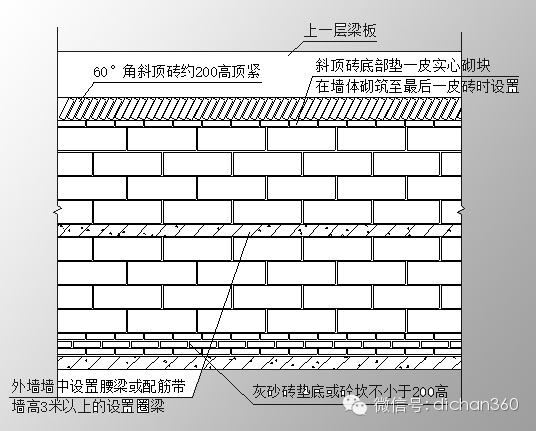 2.4 加气混凝土砌块砖墙斜顶砖、垫底砖及腰梁等设置