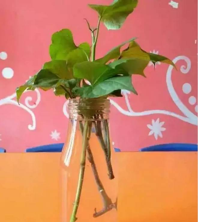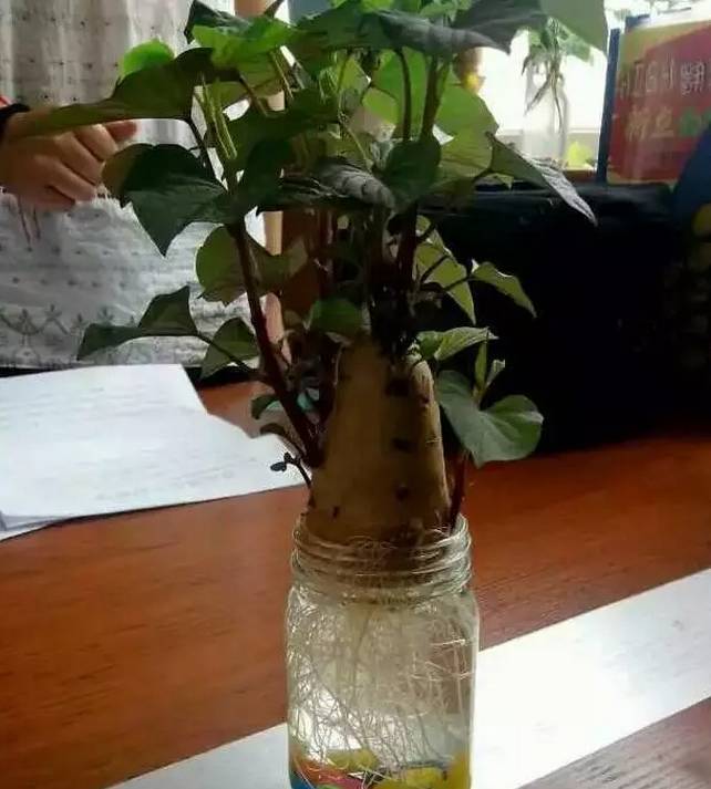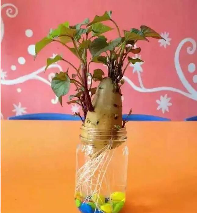 注:可以将地瓜身上的根茎剪下,插到酸奶瓶子里,又是不错的盆景。不要忘记给地瓜娃娃多多见阳光。