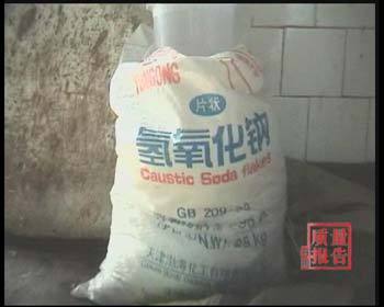 在车间的墙脚,记者发现,装着白色片状物的袋子上,赫然写着工业用"氢氧化钠"。