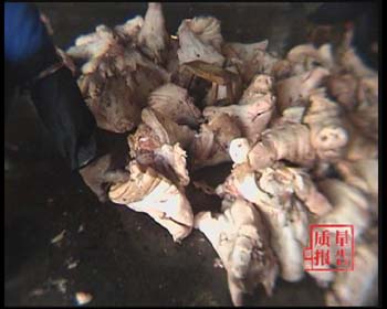据了解,在苍南县专门生产卤制熟食的厂家有上百家之多,主要集中在县城灵溪镇和附近的沪山、桥墩等镇。在灵溪镇,记者来到了华都食品厂,这家厂是苍南县中等规模的卤制食品加工厂。院子中间堆放着冷冻的鸡腿和鸡翅,很多包装袋已经破损了,工人们很随意地在上面踩来踩去。在卤制车间里,卤好的鸡翅掉在了沾满油污的地上,又被工人捡起来,扔回锅里继续加工。