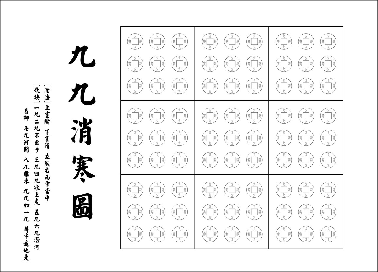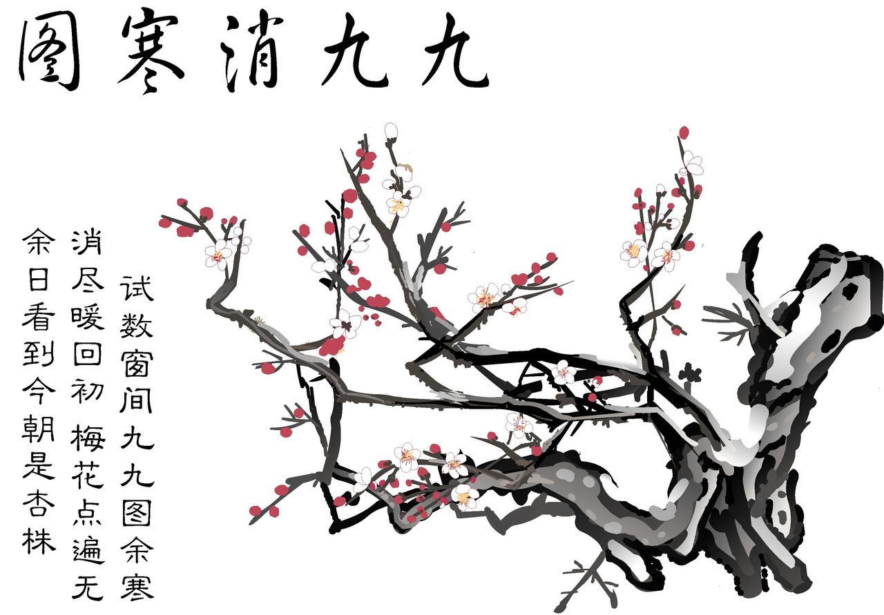 此外,还有采用图画版的九九消寒图,又称作“雅图”,是在白纸上绘制九枝寒梅,每枝九朵,一枝对应一九,一朵对应一天,每天根据天气实况用特定的颜色填充一朵梅花。元朝杨允孚在《滦京杂咏》中记载:“试数窗间九九图,余寒消尽暖回初。梅花点徧无余白,看到今朝是杏株。”