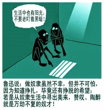 奴性潜台词:他们总会找到比你更惨的人。来证明你“其实已经很幸福了”。目的是让你知足,知足,就不会提更多的要求,知足,就不会有太多的对他们的指责。甚至,通过找一个比你过的惨的人,让你感觉产生误差,以为他们给你吃的苦还都是甜的。这是那些洗脑者的逻辑。有比你惨的人,你就觉得自己幸福了,某种程度上不是一种好的心态。你嚼着窝头,回头一看还有吃不上饭的,你就觉得窝头啃着挺香,你不去想想怎么能让自己吃上白面?你买不起鞋,回头一看还有人没有脚,你就满足了?你不去努力挣钱给自己买鞋?这几年,劝人要知足的越来越多,鼓励人有追求的却越来越少。