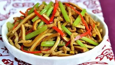 原料:豆腐干、芹菜、盐、味精、香油、油、白糖。