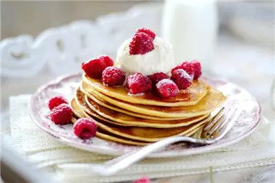 8、煎好的Pancake叠加,放上水果,筛上糖粉,淋上美味的枫糖浆,美味