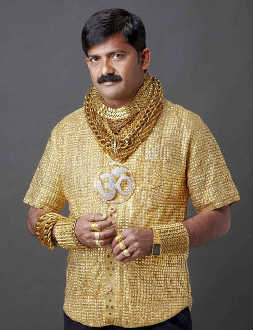 印度一名男子狂迷金饰。近日,为庆祝自己45岁生日,他为自己打造了一件重达4公斤的纯金衬衫,希望能借此打破吉尼斯世界纪录