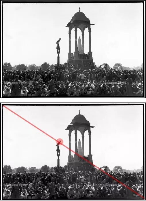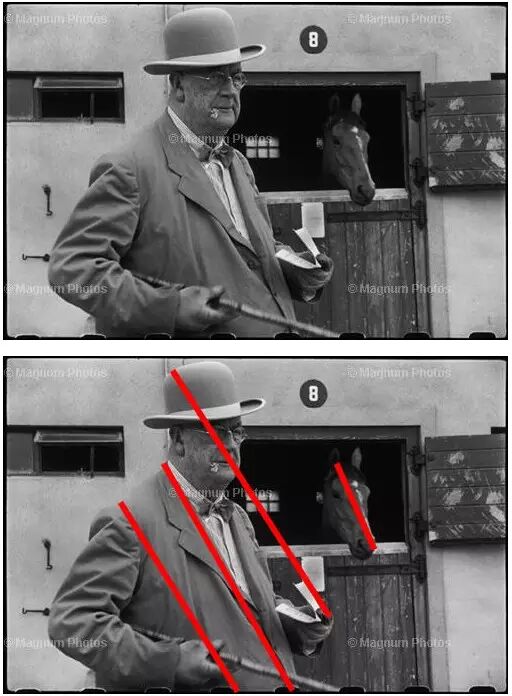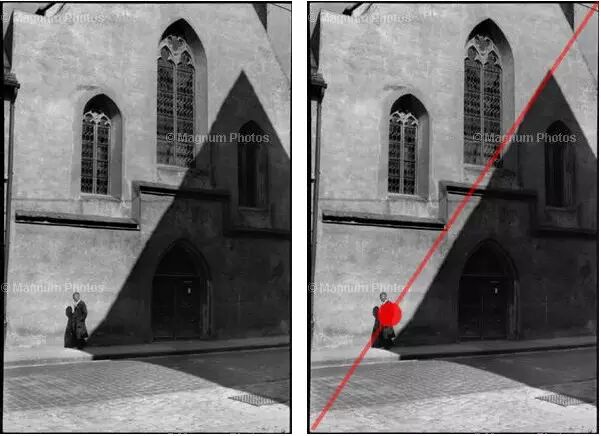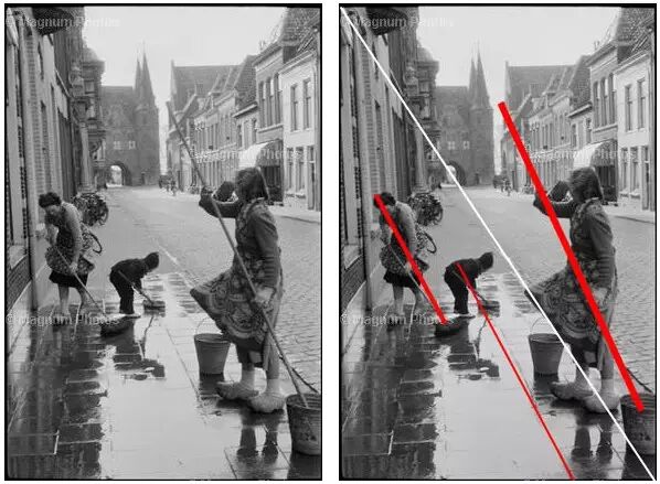各位如果看看下面的一些照片,并试着用上面这个示意图的切割方式来看布列松的作品,就会发现他大部分的作品都是以所谓「重叠正方形」的构图方式构成。而且除了「重叠正方形」构图之外,他大部份作品的构图也是以「对角线」的方式呈现,试着在他的摄影作品上拉一条对角线,例如从左上角到右下角,会发现几乎所有的主体都落在这条对角在线。布列松元身是学绘画的,因此他的构图基础很扎实。