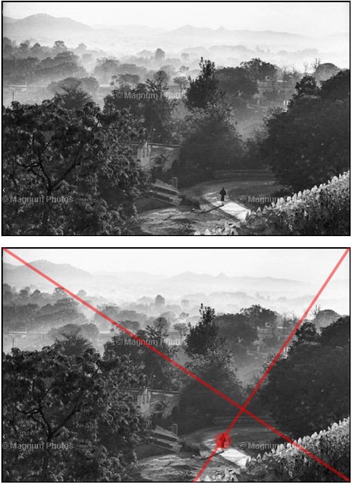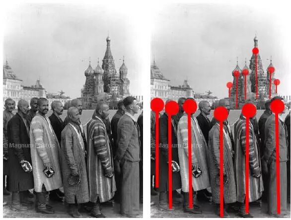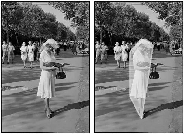 任何拍过照的人都知道,将明亮的主体放在阴暗的背景上,或是将阴暗的主体放在明亮的背中,让你想要从照片里凸显的重点从背景跳出来,将想要凸显的「主题」表达出来,但这并不意味着只是将某个对象在照片中摆的又大又前面,或光圈全开用所谓的散景(就是背景糊的像奶油的那种),如果我们将布列松的作品处理成模糊状态,还是可以清楚看到他想在照片中表达的主体,或主题。拍摄时要清楚知道什么是主,什么是从,这样欣赏照片的人才知道往哪儿看。