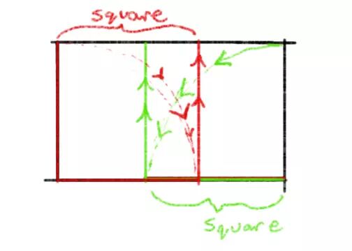 在摄影教学最常听到关于「画面比例」上的说法是「黄金三分法」,就是将画面切割成三等分,重点落在其中一个三分之一的部分,但布列松的作品鲜少看到这种比例,他运用的画面切割法是「重叠正方形」,就像下图一样,整个画面的比例可以切割成两个正方形,但中间是重迭的。