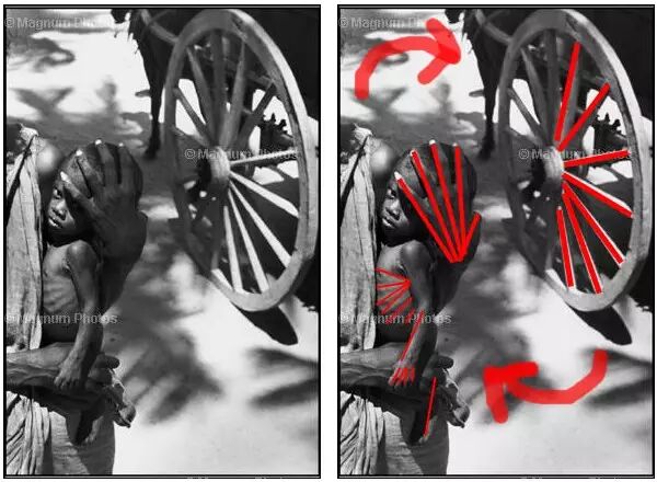 这是街头摄影师很喜欢的取材方式,除了画面会产生有趣的主题对比之外,摄影师也可以透过这种方式将画面中的故事性加强。例如下面的这张照片,抱着小孩的母亲从画面中切掉了,一般我们看到这种母亲及小孩的照片会被他们的表情以及所谓的亲情吸引,但各位有没有发现这张照片中母亲的手指,小孩干枯的肋骨,手指及手臂,与后方马车轮子的骨架产生强烈的呼应?这张照片的主体是「骨架 / 骨头 / Bone」,摄影师想凸显的主题及故事是那个瘦弱小男孩干枯的身子。若摄影师将妈妈的脸也拍进去,观众会被误导摄影师想表达的重点,会被母子间的亲情所吸引,也许是个不错的故事,但摄影师更想表达的是因为饥荒而痛苦瘦如柴骨的小男孩。