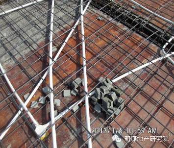 2.公共部位走道板设计板厚为160MM,板筋马凳采用长条钢筋烧焊成的钢筋撑代替,更有效避免了工人踩乱钢筋;确保板面筋的保护层厚度符合要求。