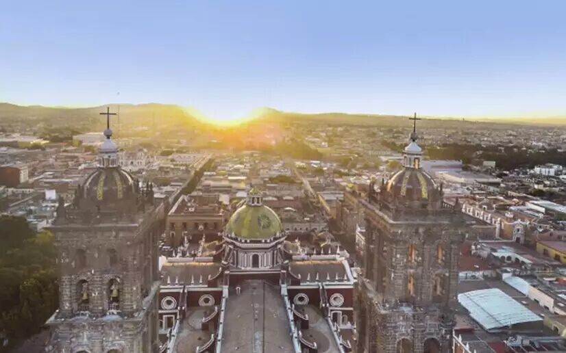 天使守卫的普埃布拉教堂,在夕阳下镀上金边