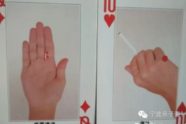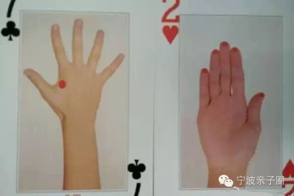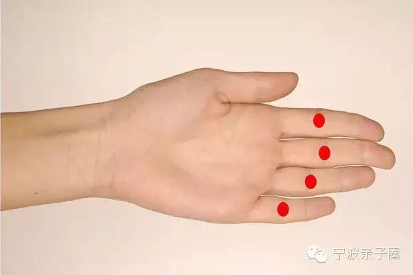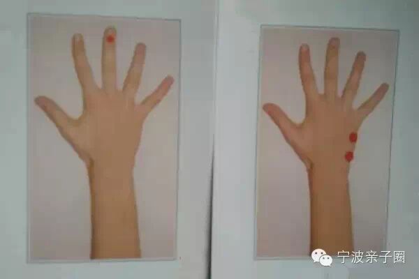 孩子受了惊吓容易发烧和夜啼,掐左图红点100下可以消除,容易受惊吓就要按压右图了,每个点50下。