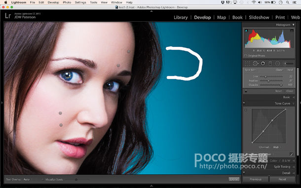 选择污点去除工具(快捷键Q),放大照片对污点进行去除。污点去除工具是选择一个源点,然后箭头指向再选取一个样本对源点进行修复或仿制,同时可以通过使用“[”和“]”按键来改变半径的大小。6.导出照片