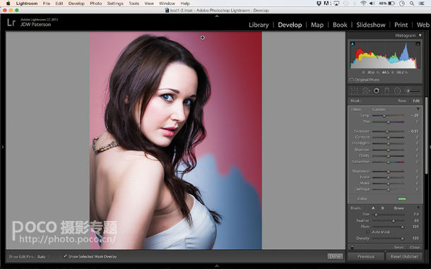 选择调整笔刷工具(快捷键K),涂抹照片的背景区域(在照片的下方有个“显示选定的蒙版叠加”,打上勾就可以显示选择的区域了)。完成选择后,调整参数如下:色温-29,曝光度-0.31,颜色选择青蓝色。4.调整色调曲线