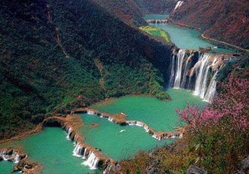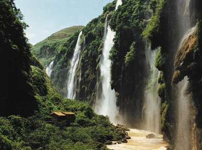 还有一个有特色的瀑布在贵州,一个叫马岭河的地方,那是一个峡谷,峡谷之间跨越一座大桥,在大桥上可以看见峡谷上无数的河水漫开流到峡谷里,一缕缕飘渺的瀑布悬挂在整个峡谷间,看图片你就知道有多么漂亮。