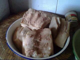第三步:开始油炸了,锅上放上大半锅油,油烧到四五成热时,就要下五花肉,不能油温太高,因为肉泡了酒,有水份,刚下锅那会溅油,小心了,我就被溅了一身油,肉一下锅,赶紧把锅盖盖上,它在里面可是辟里啪啦跳舞呢,炸一会就得给肉翻个身,炸至肉变得棕红色就OK了。这是炸好的。