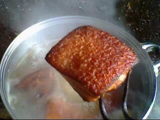 第四步:很多人以为这样就做好了,其实不然,最关键的一步还在后头,那就把炸好的肉再入沸水里煮,这样做的目地,能让扣肉皮酥、肉香滑。在沸水里煮到皮起了像PP上一样,起了小疙瘩,那就算大功告成了。