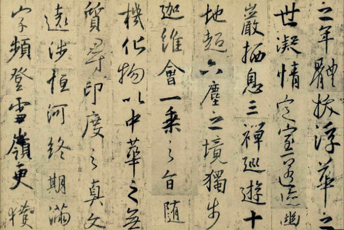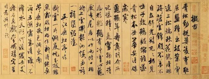 4、黄庭坚行书笔势纵横,点画开张,虽是辐射式结构,但并不疏松;体势欹斜,但并不倾倒。《松风阁诗卷》是其晚年代表作,以上特点都有充分体现。临写时需注意体察黄所追求的“笔中有物”的内涵之美,或曰“气韵”相胜。