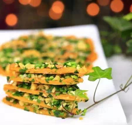 10)用切披萨的刀把糊饼切成角,焦脆的韭菜糊饼就出炉了
