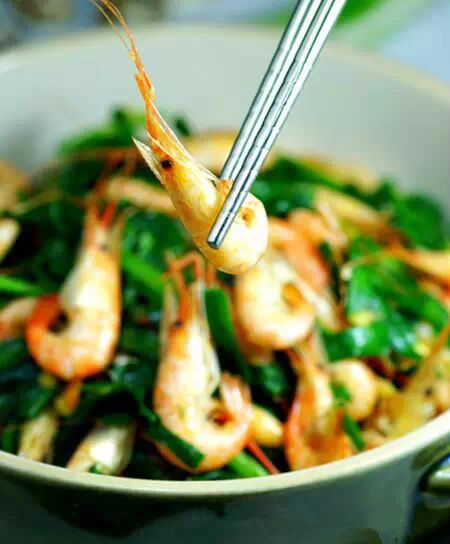 2)保留韭菜的异香和河虾的甘甜就可以了。新鲜河虾入锅的时候,要小心哦,它会蹦起来,河虾下锅要用锅盖盖半分钟,再打开,翻炒变成红色后,把配料放进去,炒入味,最后倒入切好的韭菜翻炒即可。