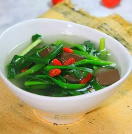 6块猪红、2两韭菜、适量油、适量盐、适量胡椒粉、数粒枸杞、1块姜