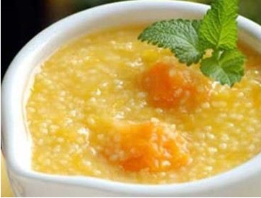 4、将蛋黄碎,南瓜泥,倒进小米粥中拌匀即可。