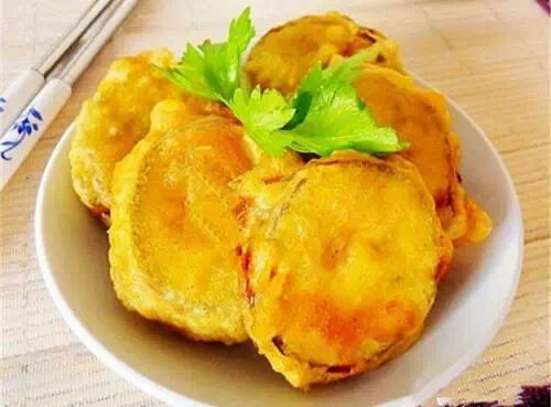 6.油烧至温热,将茄盒均匀裹好蛋液下油锅炸成金黄捞出沥油