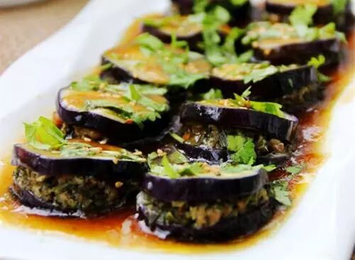 10.将芡汁淋在清蒸茄盒上,放香菜叶装饰即可