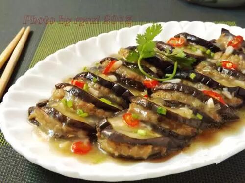 茄子1个,猪肉馅,香菜1棵,白芝麻,豆油1匙,酱油1/2匙,精盐1.5小勺,五香粉1.5小勺,味精2小勺,蚝油1匙,土豆淀粉1小勺