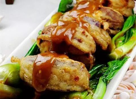 9.将准备好的茄盒放入面糊中滚一下, 让面糊将茄盒裹住;