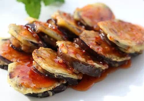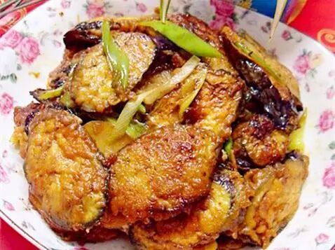 1.茄子切片,两片之间不断。成夹子状。面粉和水混合成老酸奶状。