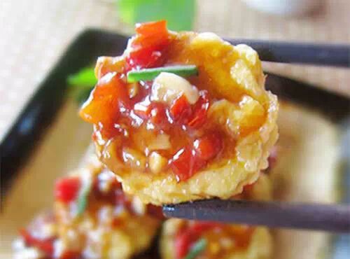 12.拿出来摆好盘, 再在茄盒表面上淋上一层泰式辣椒酱。