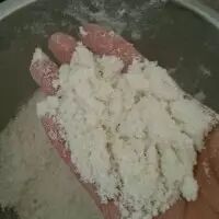 3. 用喷壶打湿的粉料就是这个样子的。有点湿湿的象雪的样子正合适。此种糕点不同于以往糕点的用水量,用水非常少,也不同于以往和面都和在一起,而是让粉料稍稍湿润又非常松散的状态即可。因为是上锅蒸熟,所以不必担心成品会松散哟。