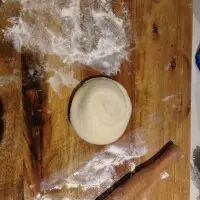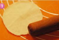 13. 取一个剂子,擀成圆形。然后按照图中的位置,用擀面杖的头,斜着擀面皮的边,一点一点捻开便是菊花皮。